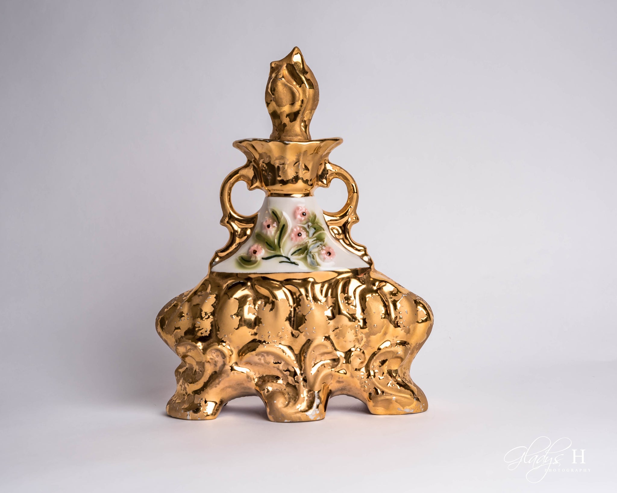 VINTAGE JIM BEAM FOOTED CERAMIC WHISKEY DECANTER. A BEAUTIFUL TWO-TONE GOLD FINISH. HAND PAINTED PINK FLOWERS ON A WHITE BACKGROUND DETAILS THE FRONT. THE TOP IS CORK WITH A TWO-TONE GOLD FINISH FINIAL ATTACHED TO IT.